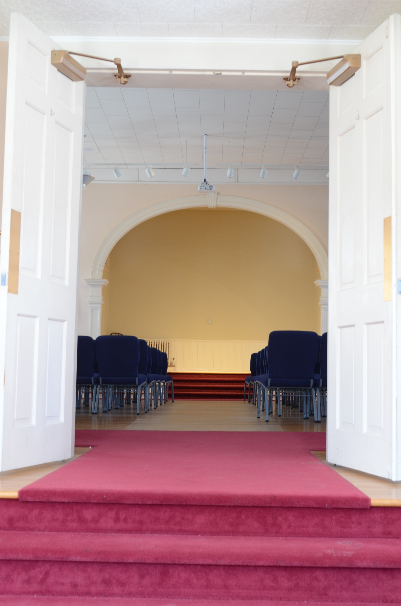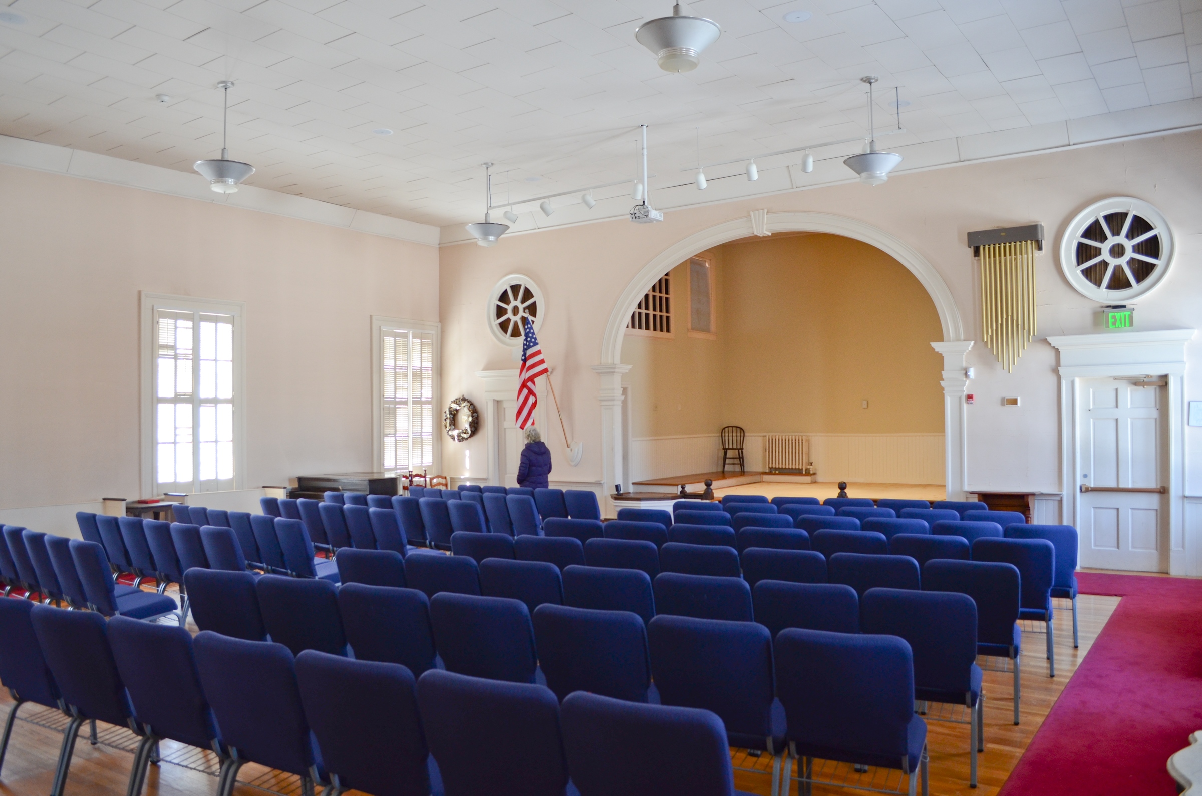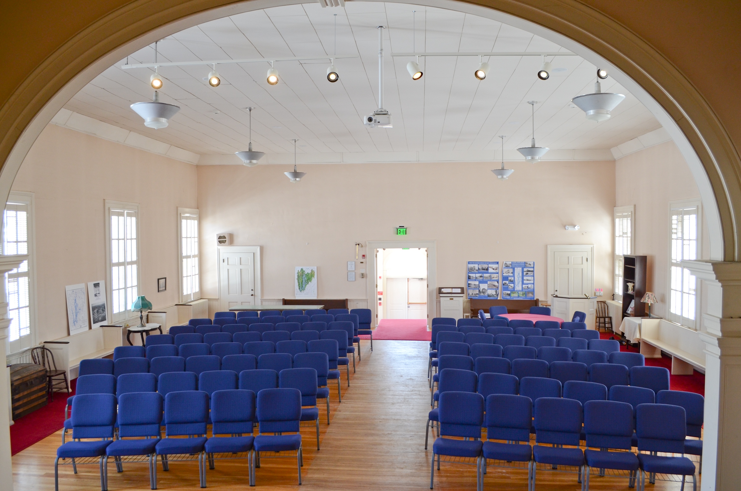 HARMONY HALL: Located on the upper level. It is flooded with natural light by large vertical shuttered windows or can be darkened for special presentations. A platform area in front is framed by an ornamental arch which serves as a great focal point for presentations or performances. Electronic presentations are possible by making use of the projection system.