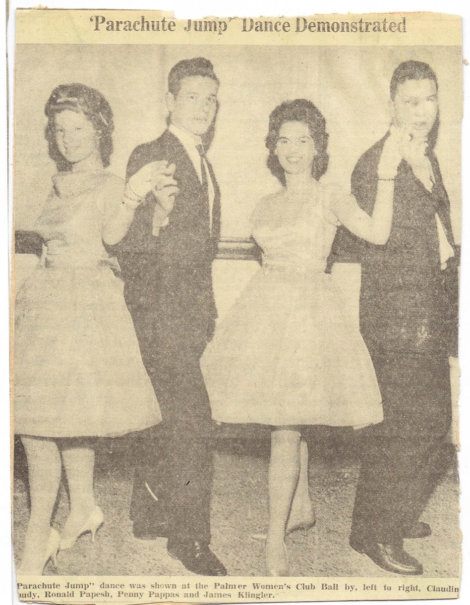 I remember the Parachute Jump. “Oh the latest thing is the Parachute Jump, the greatest thing is the Parachute Jump…JUMP, JUMP, the Parachute Jump”. Joanne Engle sang it I think. My brother, Peter Weston, also demonstrated that dance at various venues. Jimmy Klingler was one of our Brimfield group who took lessons every Saturday night in Palmer. Fun times!